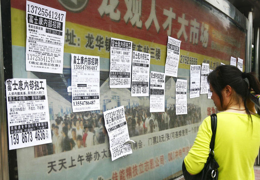 富士康龙华工业园南大门外的公交车站,站牌上的“内部招聘”广告撕了又被贴,过路的应聘者也从中获取消息。 图片拍摄于2010年5月。