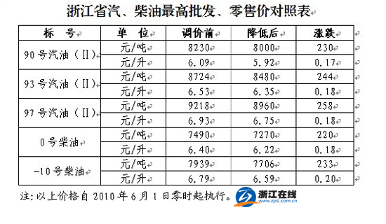 浙江在线杭州5月31日讯(记者 廖小清)今天晚上,浙江省物价局下发关于降低成品油价格的通知。从6月1日零时起,全省汽、柴油(标准品)最高零售价格每吨分别下调230元和220元,非标准品汽、柴油最高零售价格按国家规定的品质比率也相应下调。