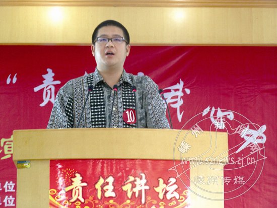 “感悟责任,唤醒沉睡的责任心;承担责任,让责任成为习惯;超越责任,让责任成就人生……”5月31日上午,甘霖镇政府的会议室济济一堂, 19位35岁以下的年轻镇干部和“村官”,正在激昂地演讲着“责任在我心中”。自从今年3月甘霖镇开设“责任讲坛”以来,镇主职领导带头开讲,通过“责任讲坛”进一步强化干部的责任心。图为该镇大岩坂村的“村官”许嵩正在演讲。