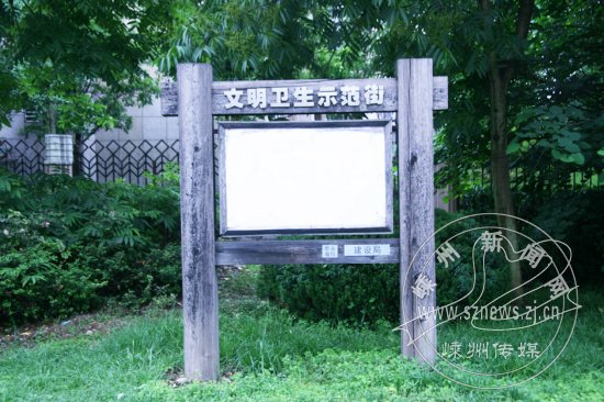 官河南路中段绿化带立着一块文明卫生示范街广告牌,牌上原有的宣传标语和宣传画已退色,形成一片空白,请有关部门及时修复。