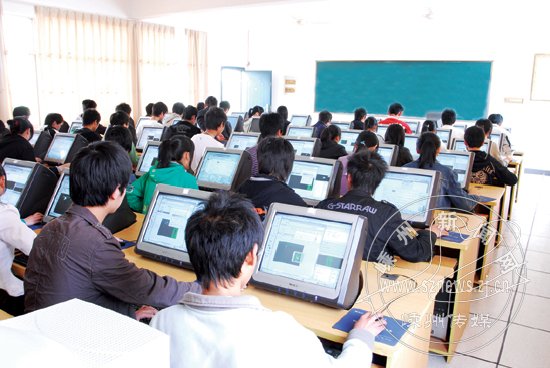 近年来,学校抓住机遇不断投入资金改善办学条件,校容校貌发生了日新月异的变化,图为学生在宽敞明亮的多媒体电教室上课。