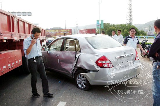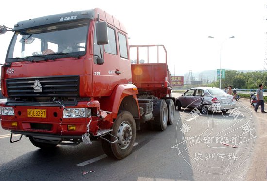 6月2日下午4点左右,市区双塔大桥东侧引桥处发生一起车祸,一辆大型半挂车与尼桑轿车相撞,幸无人员伤亡。