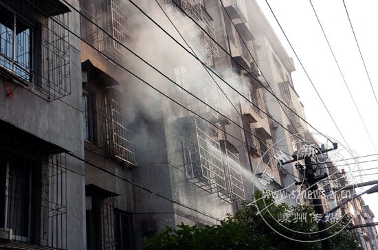 记者在现场看到,阵阵浓烟从窗户飘出,楼下的消防队员正在用水枪对准窗户灭火,楼上的消防队员戴着防护面罩用水枪灭火。阳台下水管和楼梯都水流成河了。