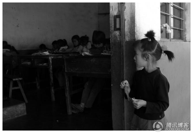 东川区舍块乡麻地小学,一小女孩渴望上学来到学校教室听课。