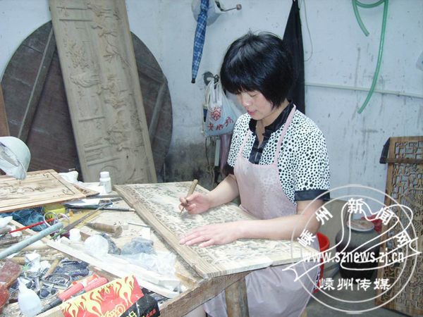当你来到黄泽镇走进许多乡村的巷子里,随处可以听到那“嘀嘀笃笃”的用凿子雕琢木头的声音,循声望去,只见有许多家庭妇女或者是年长的老者,有的在堂屋里用那穿孔锯依照木板上的图样在上下锯拉图案;有的则在空气新鲜的走廊下左手拿着凿子,右手挥舞着那形状如斧的木柄扁榔头,在精心雕刻着那木板中的“春夏秋冬,梅兰竹菊”……