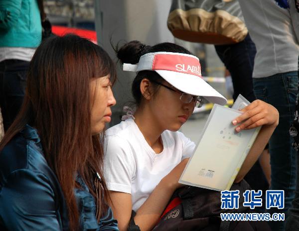 6月7日,在内蒙古呼和浩特第二中学高考考点外,一位考生在进行最后冲刺。当日是2010年全国高考第一天,共有957万名考生走进考场。 新华社发(刘勇贞摄)