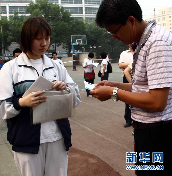 6月7日,北京一考场工作人员在检查准考证。今年北京市有8万名考生参加高考。当日是2010年全国高考第一天,共有957万名考生走进考场。 新华社记者 高学余摄