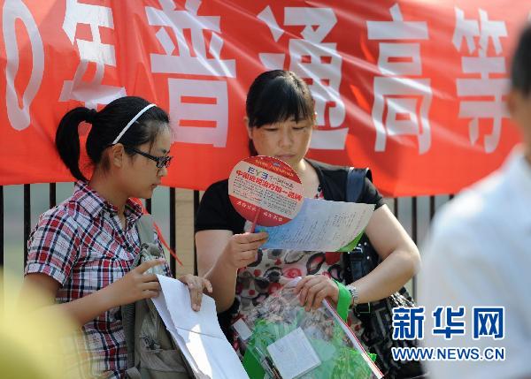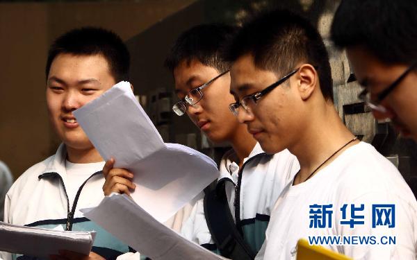 6月7日,北京几位考生进入考场前仍在复习功课。今年北京市有8万名考生参加高考。当日是2010年全国高考第一天,共有957万名考生走进考场。 新华社记者 高学余摄