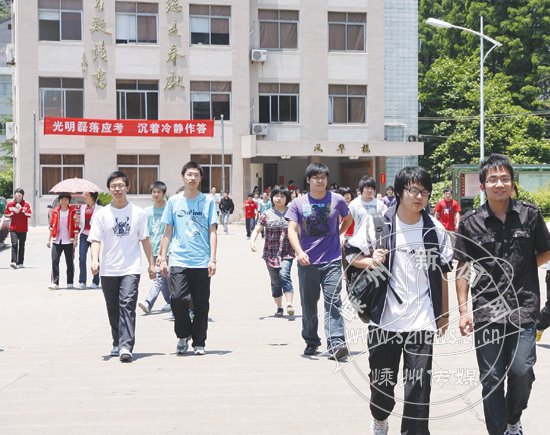 昨天上午,2010年全国普通高校招生考试正式举行,我市5526名考生正式迎战高考,其中参加统招统考的普通高校考生为5041人,参加单考单招的高职考生485人。全市共设8个考点,198个考场。图为考生在首场语文考试之后轻松走出考场。