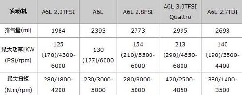 动力方面, 最新的3.0TFSI发动机取代了4.2FSI成为目前A6L中级别最高的车型,除此之外,从2.0TFSI、2.8FSI、3.0TFSI、2.4自然吸气到2.7TDI柴油发动机,奥迪A6L能提供五种排量的发动机可选,这也是其他竞争对手所不能及的。