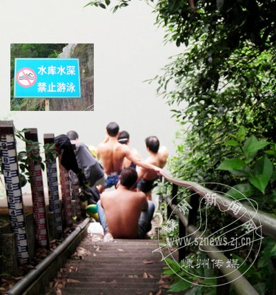 随着天气转热,去南山水库游泳的人又多了起来。南山水库为市区居民的饮用水源,保护水源人人有责。另外,历年来因游泳也发生过不少溺水事故。虽然水库醒目位置立有“水库水深禁止游泳”标牌,有关部门也曾三令五申,可还是有人下水游泳(如图)。