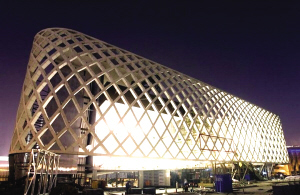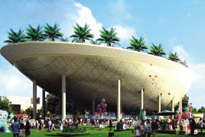 展馆形似一艘高悬于空中的“月亮船”,在地面和屋顶栽种枣椰树,形成一个树影婆娑、沙漠风情浓郁的空中花园。馆内介绍沙特阿拉伯地理、人口、历史、政治等内容,重点展示四种类型的城市:能源之城、绿之城、文化古城、新经济之城,揭示水、石油和知识是沙特阿拉伯城市发展的安身立命之本。