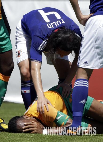 6月4日,日本队球员田中斗笠王(上)在比赛中侵犯科特迪瓦队球员德罗巴后,查看德罗巴的伤情。当日,在瑞士锡永进行的日本队与科特迪瓦队的世界杯热身赛中,德罗巴左臂骨折受伤下场,恐将退出本届世界杯。