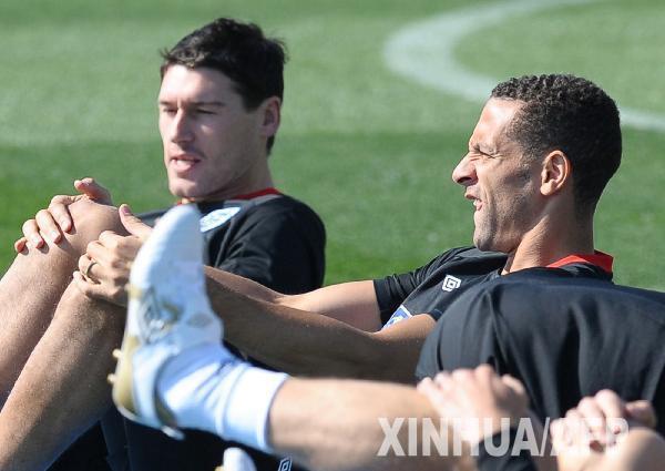6月4日,英格兰球员费迪南德(右)在训练中。当日,费迪南德在南非鲁斯滕堡进行的球队训练中膝盖受伤,恐缺席本届世界杯。
