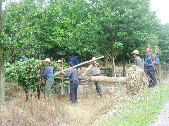 近日,记者驱车进入下王镇地界,沿途看到一群群村民合力将一棵棵大树从山上抬下来,装上等候在路边的大卡车上(如图)。据小溪村的徐大伯介绍,这一带的苗木至少有五六年无人问津了,但村民们没有气馁,而是耐心培养优质苗木等候市场复苏,今年终于等来了外地客商。据悉,今年我市花卉苗木销售明显回暖,1—5月,实现花木销售产值2.2亿元,比去年同期增加0.5亿元。