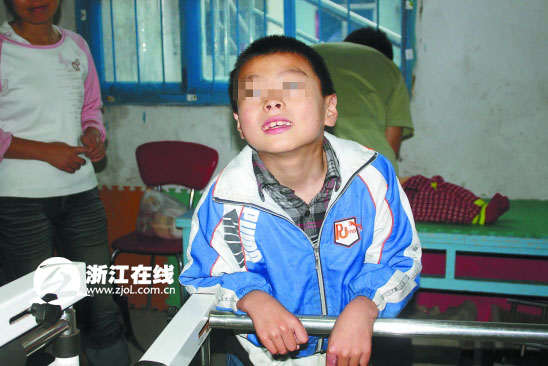 9岁的叶海翔在康复器械上运动着,汗水在小脸上滚动。他是一个兼有自闭症的脑瘫儿:手脚痉挛不能正常行走。