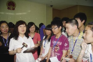 6月11日,市人民法院举行“公众开放日”活动,邀请人大代表、政协委员、学生代表等各界代表参观了解法院。法院安排了多项活动,如亲近审判、旁听庭审案件;开展座谈会,听取人大代表、政协委员对法院工作的意见和建议;指导学生了解法槌、法袍等审判设施,并让学生进行模拟庭审,以促进他们知法、学法、用法的能力。图为学生了解法槌的场景。