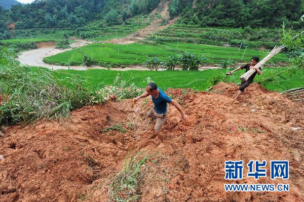 6月16日,广西苍梧县沙头镇道路被泥石掩埋,村民艰难前行。据广西壮族自治区民政厅16日17时统计,连日的强降雨已造成广西7市24县(区)受灾,受灾人口合计63万人,累计紧急转移安置9.82万人;农作物受灾面积33.99千公顷,其中成灾15.05千公顷,绝收1.5千公顷;因灾倒房2023间。新华社记者黄孝邦摄