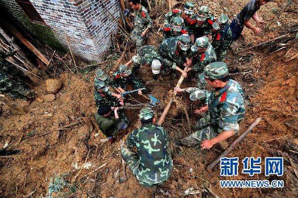 6月16日,在苍梧县沙头镇双尚村山体滑坡现场,武警战士在搜救失踪人员。 6月15日,广西梧州市苍梧县遭遇强降雨袭击,沙头镇双尚村多处发生山体滑坡等地质灾害。截至16日晚9时,死亡人数升至8人,还有7人失踪。目前,数百名解放军、武警官兵和当地干部群众正在现场全力搜救。新华社记者黄孝邦摄