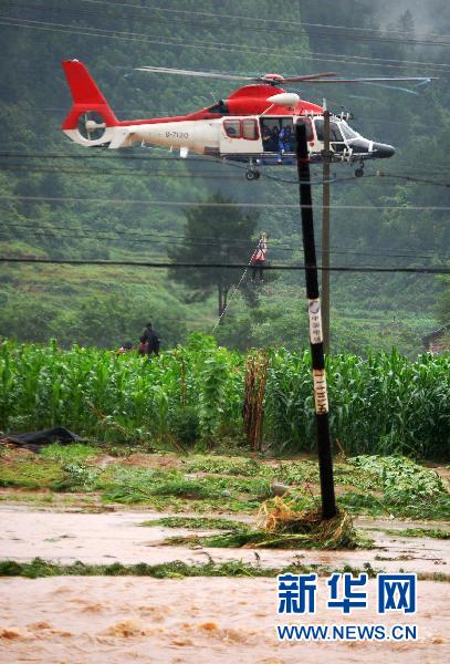 6月16日,救援直升机在营救被洪水围困的群众。当日,交通运输部南海第一救助飞行队在广西来宾市金秀瑶族自治县三江乡同化村大丈屯成功将13名被洪水围困的群众救出。16日凌晨三江乡在3个小时内降雨超过100毫米,暴发的山洪将三江乡同化村大丈屯变成了“江心洲”,这个屯的一个木材加工厂内13名群众被洪水围困,存在生命危险。由于水流湍急,冲锋舟无法进行施救,广西壮族自治区防汛抗旱指挥部请求交通运输部派遣直升机救援。新华社发(李波摄)