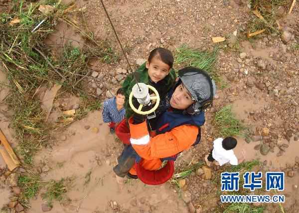 6月16日,一名救援人员在营救被洪水围困的儿童。当日,交通运输部南海第一救助飞行队在广西来宾市金秀瑶族自治县三江乡同化村大丈屯成功将13名被洪水围困的群众救出。16日凌晨三江乡在3个小时内降雨超过100毫米,暴发的山洪将三江乡同化村大丈屯变成了“江心洲”,这个屯的一个木材加工厂内13名群众被洪水围困,存在生命危险。由于水流湍急,冲锋舟无法进行施救,广西壮族自治区防汛抗旱指挥部请求交通运输部派遣直升机救援。新华社发