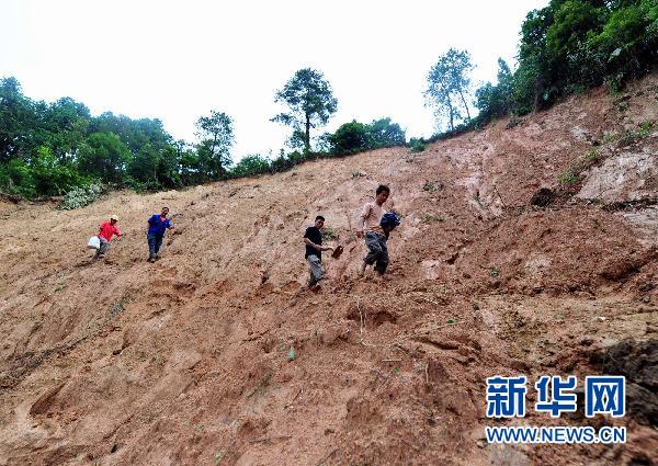 6月16日,参与救灾的干部群众在刚刚发生山体滑坡的斜坡上行进。 6月15日,广西梧州市苍梧县遭遇强降雨袭击,沙头镇双尚村多处发生山体滑坡等地质灾害。其中受灾最严重的瓦两屯有两处发生山体滑坡,多人被掩埋。村部通往瓦两屯的山路随处可见大面积滑坡和塌方,绝大多数路段被山坡上冲下的泥浆掩盖,淤泥最深达半米,救援部队的官兵和干部群众冒着危险,带着救灾物资,徒步在泥泞的山路上艰难前行,赶往事发地。新华社记者 黄孝邦 摄