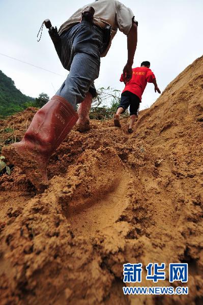 6月16日,参与救灾的干部群众在刚刚发生山体滑坡的山路上艰难行进。 6月15日,广西梧州市苍梧县遭遇强降雨袭击,沙头镇双尚村多处发生山体滑坡等地质灾害。其中受灾最严重的瓦两屯有两处发生山体滑坡,多人被掩埋。村部通往瓦两屯的山路随处可见大面积滑坡和塌方,绝大多数路段被山坡上冲下的泥浆掩盖,淤泥最深达半米,救援部队的官兵和干部群众冒着危险,带着救灾物资,徒步在泥泞的山路上艰难前行,赶往事发地。新华社记者 黄孝邦 摄