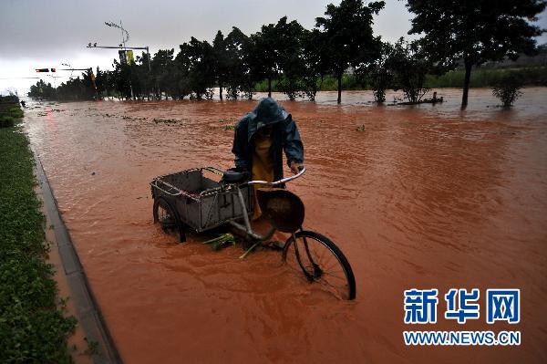 6月16日,一名市民在河源市建设大道上涉水前行。 6月14日至15日,广东省河源市普降大到暴雨,局部地区降下特大暴雨,造成河源市紫金、东源、源城3个县、区的34个乡镇受灾,受灾地区目前已派出武警部队和轻