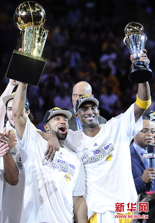6月17日,洛杉矶湖人队球员费舍尔(前左)和队友科比(前右)分别举起总冠军奖杯和最有价值球员奖杯。