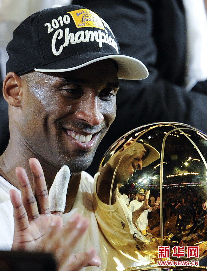 6月17日,洛杉矶湖人队球员科比在颁奖仪式上手持总冠军奖杯。当日,在2009-2010赛季NBA总决赛第七场比赛中,洛杉矶湖人队主场以83比79战胜波士顿凯尔特人队,从而以4比3的总比分捧得NBA总冠军奖杯。这是洛杉矶湖人第16次获得NBA总决赛冠军。新华社记者戚恒摄