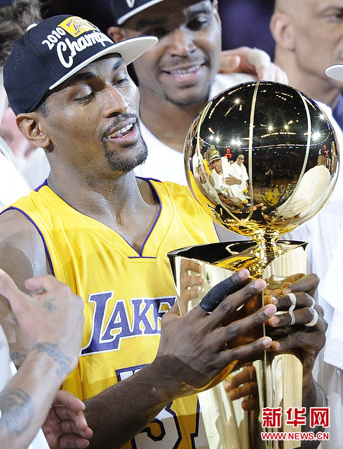 6月17日,洛杉矶湖人队球员阿泰斯特手持总冠军奖杯。当日,在2009-2010赛季NBA总决赛第七场比赛中,洛杉矶湖人队主场以83比79战胜波士顿凯尔特人队,从而以4比3的总比分捧得NBA总冠军奖杯。这是洛杉矶湖人第16次获得NBA总决赛冠军。新华社记者戚恒摄