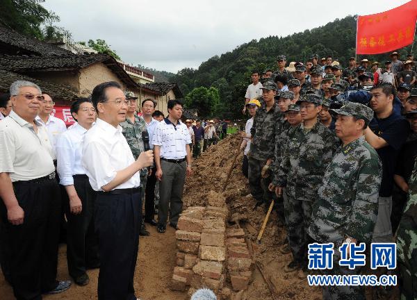 6月19日至20日,中共中央政治局常委、国务院总理温家宝来到广西梧州市,实地察看汛情、灾情,慰问奋战在抗洪救灾一线的干部群众,主持召开会议,部署防汛抗洪救灾工作。这是6月20日,温家宝总理在苍梧县沙头镇双尚村杉木坪自然村,慰问正在清理废墟的战士和村民。新华社记者李涛摄