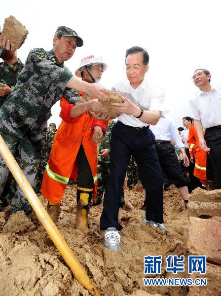 6月19日至20日,中共中央政治局常委、国务院总理温家宝来到广西梧州市,实地察看汛情、灾情,慰问奋战在抗洪救灾一线的干部群众,主持召开会议,部署防汛抗洪救灾工作。这是6月20日,温家宝总理在苍梧县沙头镇双尚村杉木坪自然村与战士们一起赤手清理废墟中的红砖。新华社记者李涛摄