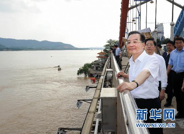6月19日至20日,中共中央政治局常委、国务院总理温家宝来到广西梧州市,实地察看汛情、灾情,慰问奋战在抗洪救灾一线的干部群众,主持召开会议,部署防汛抗洪救灾工作。这是6月19日,温家宝总理在梧州市鸳鸯江大桥上了解梧州防洪体系建设。新华社记者李涛摄