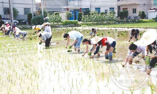 随着裁判的一声令下,在田里一字排开的大学生村官迅速弯腰,拿起秧苗大展“拳脚”(如图)。只见几位农村出身的“熟手”,快速地将一束束秧苗插进泥水中,很快绿油油的秧苗就在水田里排成行。而几位来自市区的村官还是第一次下田,在深一脚浅一脚的稻田里,甚至连站稳都显得很困难。生动有趣的比赛场景,也吸引了当地不少村民前来观战。比赛很快结束,最后裁判按插秧速度、密度、深度、均匀整齐度等质量指标进行评分,按得分高低评出一、二、三等奖,镇领导为得奖村官颁发奖状。