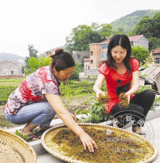 正在翻晒金银花的郑梅芳告诉记者,一个人每天能摘五六斤干花,干花每斤能卖二十五六元,一天下来,挣的钱比摘茶叶还多。她说,前几年摘金银花的主要是一些老人,进山摘花无非是换点零用钱花花。非典那年,金银花价格一下子从10多块暴涨到50多块,并且磐安的药材生意人还上门来采购,有多少要多少。这让老人们着实发了一笔“洋财”。第二年,金银花开的时候,村里的年轻人都背着竹篮像采摘春茶一样蜂拥而去。这年金银花价格跌了下来,每斤只有20来块,但年轻人手脚快,采摘方法也进行了改良,以前老人们去采摘的时候,都是一朵朵花干干净净地摘,而年轻人则是顺着藤一把把连叶子连花都捋下来。晚上回家时,一家子闲下来,再把粗叶子捡干净。