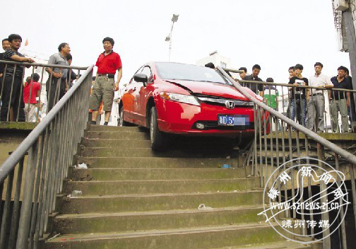 事件:据目击者介绍,一辆红色轿车由于司机驾车不慎,差点飞落桥下,幸好有栏杆挡住,才避免了一场严重事故。