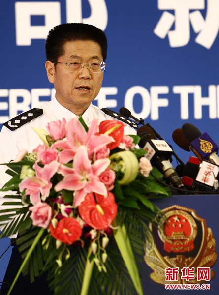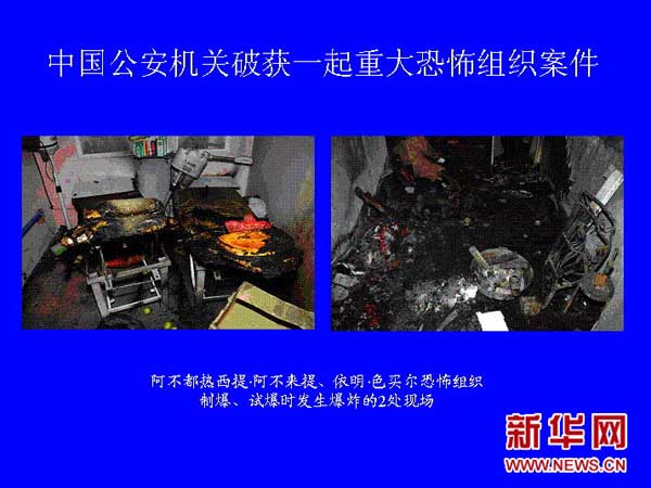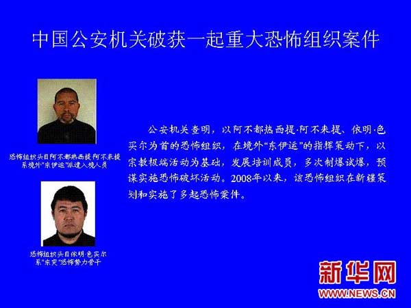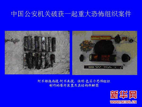 6月24日,公安部新闻发言人武和平介绍,最近,中国公安机关破获了一起重大恐怖组织案件,抓获以阿不都热西提·阿不来提(男,新疆莎车县人,42岁)、依明·色买尔(男,新疆岳普湖县人,33岁)为首的10余名恐怖组织头目、骨干及成员,缴获了一批自制爆炸爆燃装置等作案工具,有力挫败了恐怖分子的破坏图谋,及时消除了社会安全隐患。新华社记者 袁满 摄