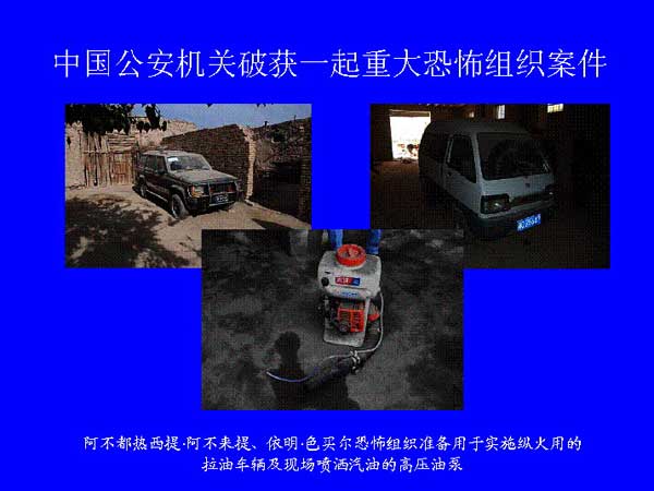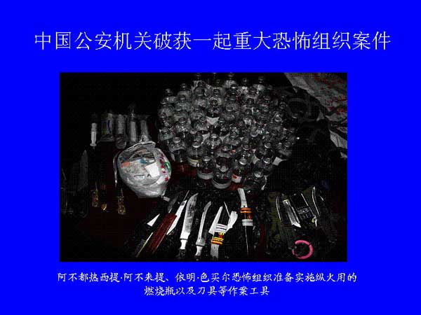 6月24日,公安部新闻发言人武和平介绍,最近,中国公安机关破获了一起重大恐怖组织案件,抓获以阿不都热西提·阿不来提(男,新疆莎车县人,42岁)、依明·色买尔(男,新疆岳普湖县人,33岁)为首的10余名恐怖组织头目、骨干及成员,缴获了一批自制爆炸爆燃装置等作案工具,有力挫败了恐怖分子的破坏图谋,及时消除了社会安全隐患。新华社发