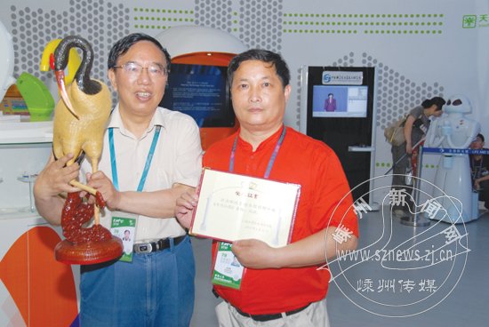 斯浙鹏手持荣誉证书与生命阳光馆馆长曹子平(左)合影