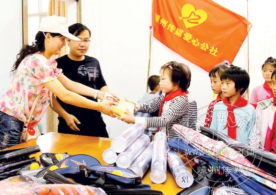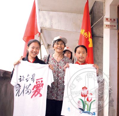 这是一所依山临水的山村学校,学校不大,但窗明几净。此时会议室庞大的会议桌上,整齐地排满了我们带去的各种用品。人民医院团支部买来的书籍依然散发着油墨的清香;“井桥头”买来的体育用品安静地躺在桌子上,还有此前社员们捐赠的体育用品;喻潇芳的几件手绘爱心衫最是醒目。因为是学生临时绘制的,衣衫上油彩未干,喻潇芳还用报纸将它小心折叠了。