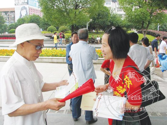 为让广大群众特别是青少年了解毒品危害,远离毒品,6月26日,在国际禁毒日到来之际,我市禁毒办开展了以“进社区、进学校、进企业、进农村、进家庭、进娱乐场所”等“六进”为主题的禁毒宣传活动。在活动中,禁毒志愿者分发了禁毒宣传资料3000多份,生动形象地介绍了《禁毒法》相关知识和新型毒品的种类、危害及预防措施等,增强了广大群众自觉抵制毒品、加强自我保护的意识。图为志愿者向群众分发宣传资料。