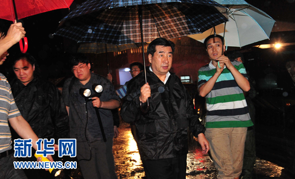 6月29日凌晨,在贵州省关岭县岗乌镇大寨村山体滑坡灾害现场,中共中央政治局委员、国务院副总理回良玉冒雨指导抗灾工作。