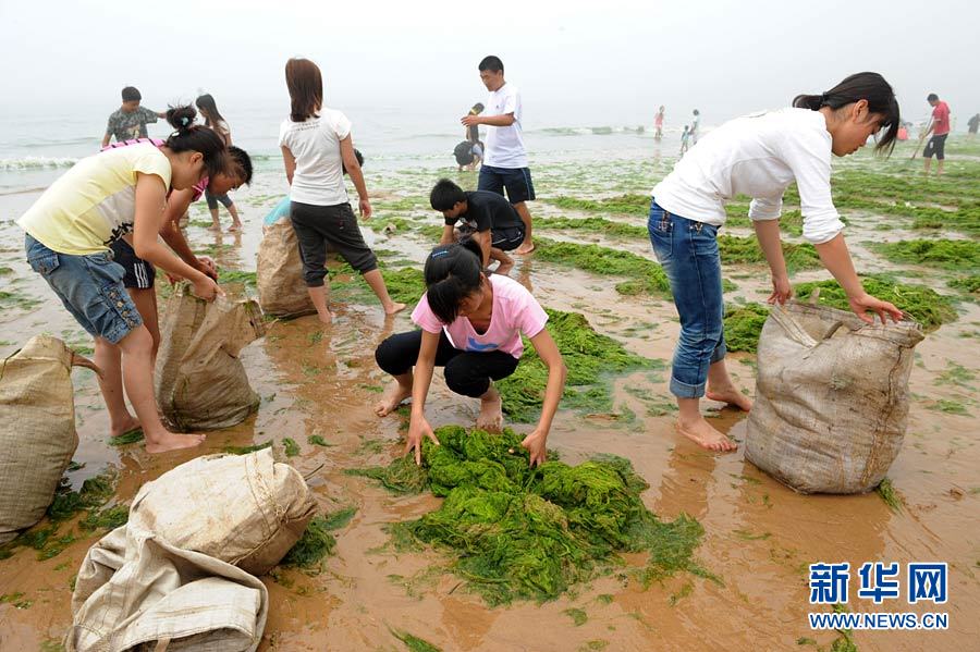 目前,青岛市已启动浒苔处置三级响应,抽调各种机械、车辆828台(辆),动员人员6000余人,严阵以待,确保及时有效应对浒苔灾害。浒苔属于绿藻类,因海洋富营养化而肆虐生长,现在国外已经把浒苔一类的大型绿藻爆发称为“绿潮”,视作和赤潮一样的海洋灾害。新华社记者 李紫恒摄