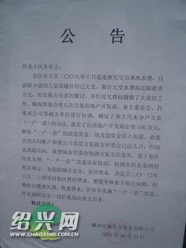 本网讯 从25号晚上11点左右开始到现在,嵊州卧龙山水绿都小区900多住户遭嵊州市自来水公司断水。自来水公司称断水理由是,小区业主从2008年10月起拖欠六十多万元水费。但业主们说,绝大多数业主已缴清自小区建成到2009年的水费,这些水费是前任物业代为收取需上交自来水公司的。而前任物业已撤离小区。现任物业是2010年重新聘任的,2010年期间的水费现任物业还没收过。
