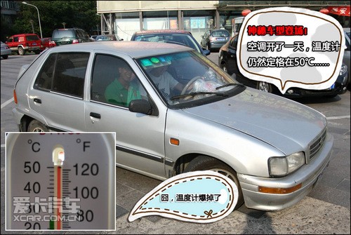 最后我们的神秘车型终于要登场了,刚钻进车子就感觉到一股热浪,再看温度计,已经死死地定格在50度,估计温度想往上飙也只恨刻度太少不能表现了,打开空调的冷风,怎么感觉都是热风吹来?