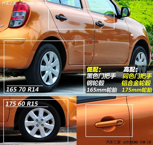 另外,两种不同车型的轮胎规格也有差别。高配车上使用的是15英寸铝合金轮毂配以175mm的轮胎,而低配则完全小一号儿。有一点比较欣慰,虽说低配车使用的是钢轮毂+塑料罩,但从效果上却很难看出它俩的差距,并不是因为大小的问题,而是两个轮毂的样式非常相似!都是7辐条的造型!