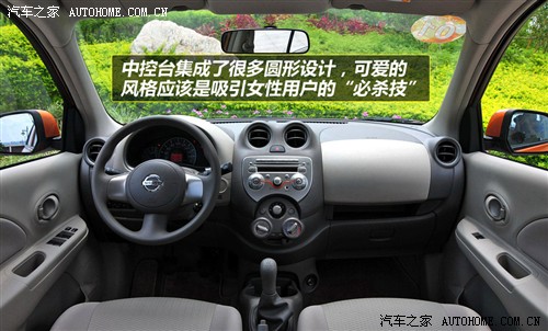 在车展静态评测中,我就曾说过March的风格比较女性化,这个观点到今天我仍然坚持着!看看它的内饰吧,大量的圆形元素组成的是柔美或是说可爱,很显然它缺少些男子气概,相反则会成就女性消费者的审美方向。