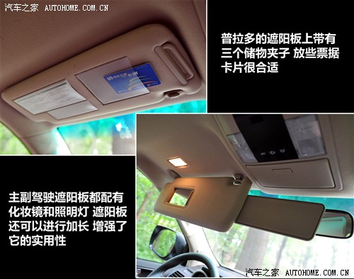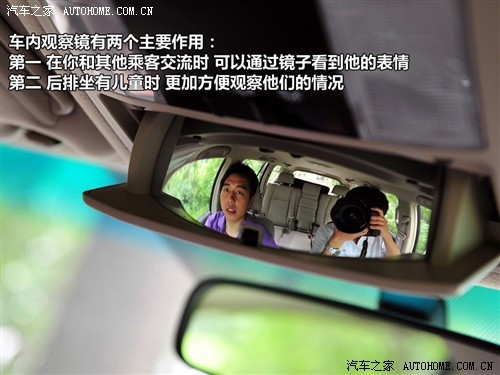 中控台做工比较细致,表面都覆盖了软性材料,而在本应是眼镜盒的位置放置了一个车内观察镜,通过它可以更好的观察后排乘客的情况。遮阳板的实用性很强,关闭时上面的储物夹子可以放一些票据或卡片,完全打开后遮阳的效果也很理想。