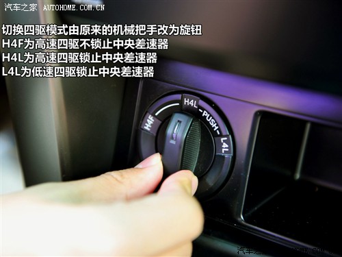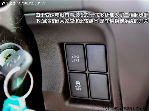 方向盘的左右两侧各有一组控制按钮,左侧为后视镜和大灯调节,值得一提的是普拉多还带有电动后视镜折叠功能,在狭窄路面会车时,这个功能既方便又有面子。右侧的两个按键和安全息息相关,2档起步可用于冰雪路面,车身稳定系统则可防止车辆失控。中控下方的四驱模式切换为旋钮式,比上代的机械把手使用更方便。